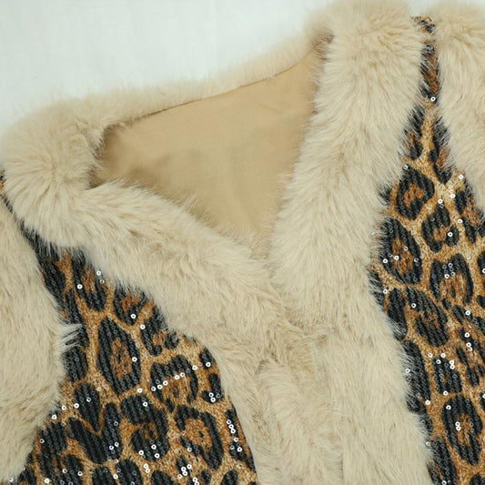 Sexy Leopard Sequins Fur Patchwork Sleeveless 2pcs Pant Sets