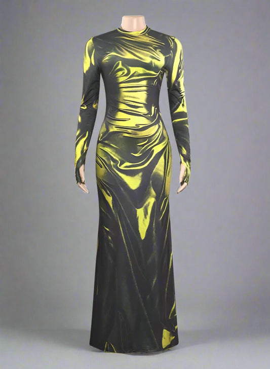 Colorblock Abstract Print Long Sleeves Maxi Dress