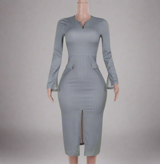 Striped Split Hem V Neck Long Sleeve Midi Dress