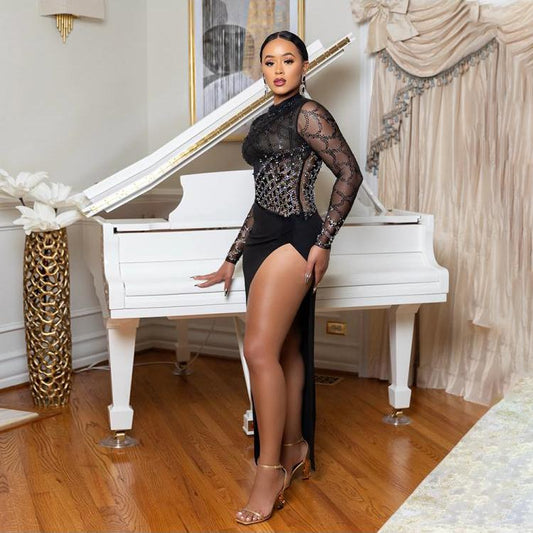 Hotfix Rhinestones Split Hem Long Sleeve Maxi Dress