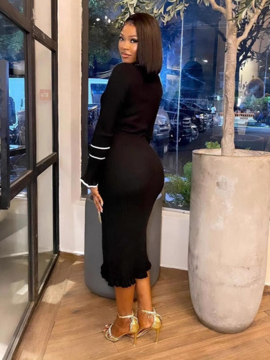 Knitted Lapel Trumpet Sleeve Midi Dress