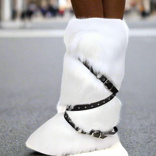 Colorblock Fluff Cross Belt Thigh-High Boots
