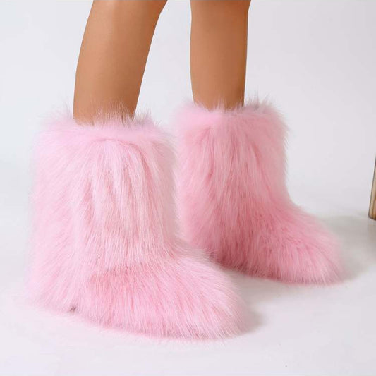 Fluffy Solid Color Round Toe Flat Heel Boot