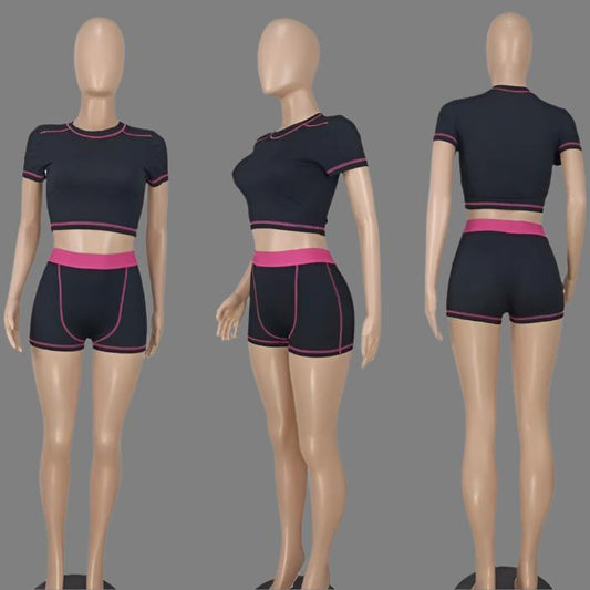 Ribbed Colorblock Seam Line Cropped Short Sets