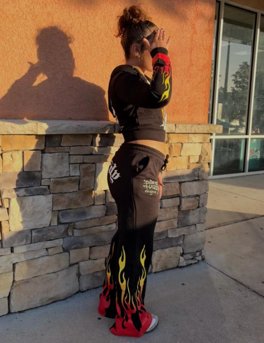Tiger Flame Printed Hooded Wide Leg Pant Sets