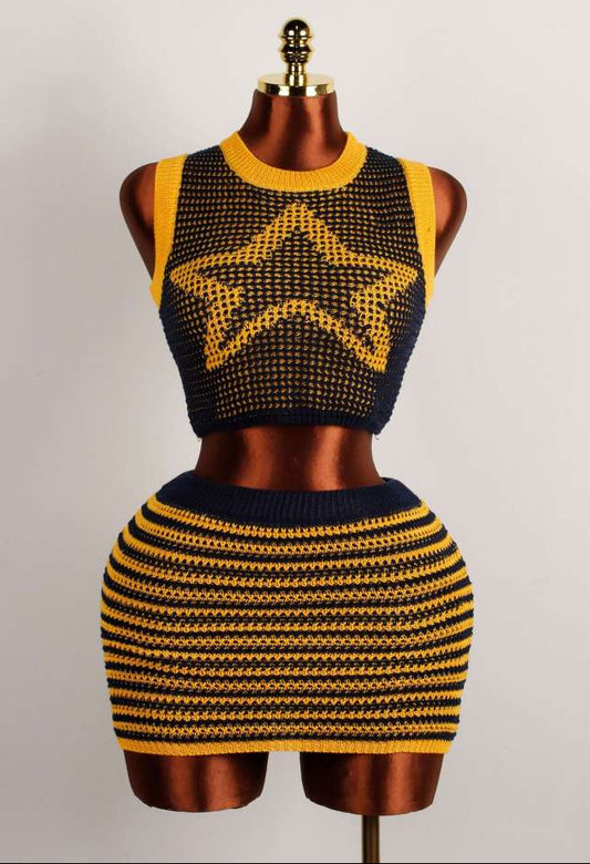 Star Knitting Colorblock Striped Cropped Skirt Sets
