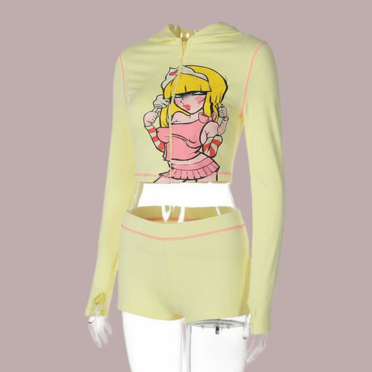 Cartoon Printed Seam Line Hooded Short Sets