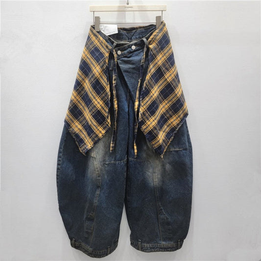 Plaid Fart Curtain Washed Denim Barrel Jeans