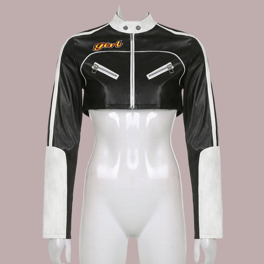 Colorblock Number Striped Trim Cropped Jacket