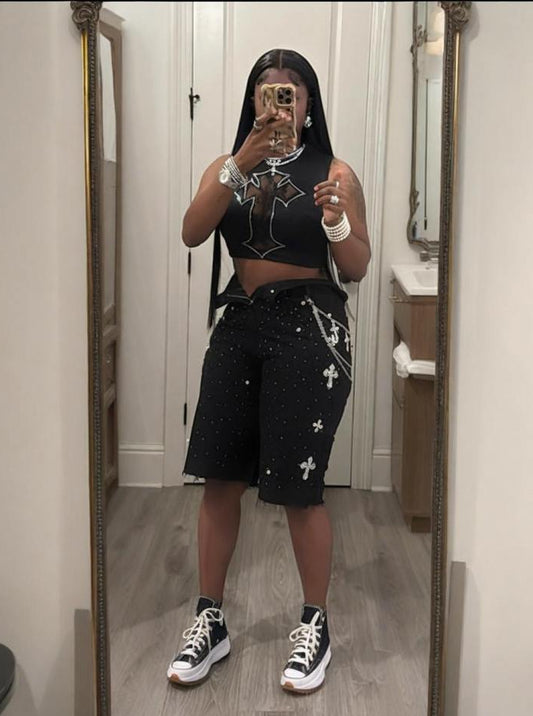 Distressed Cross Rhinestones Denim Shorts