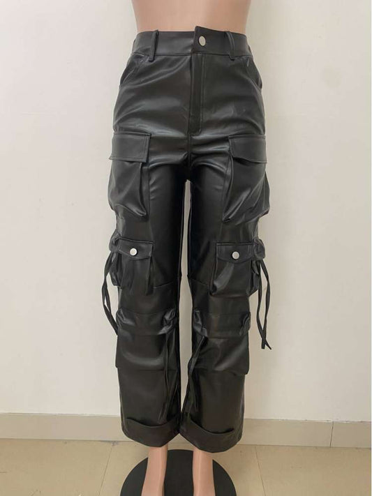 Plain Leather Multi Pocket Cargo Pants
