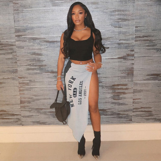 Letter Printed Colorblock Knot Split Hem Skirts