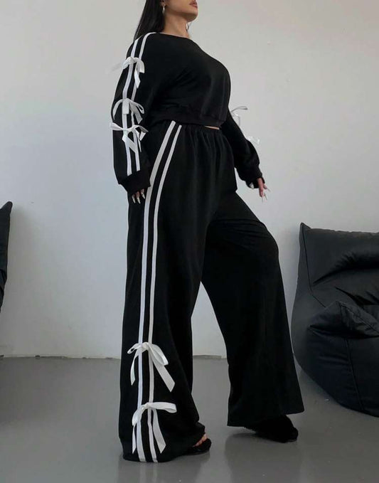 Bow Striped Trim Loose Sweatpants Set