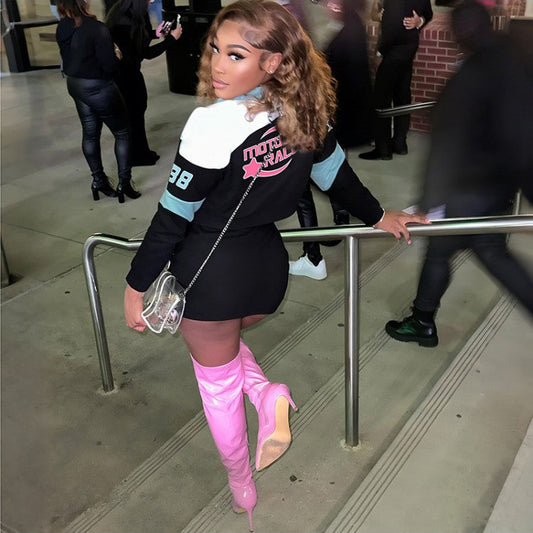 Colorblock Zipper Coats Fitted Short Sets