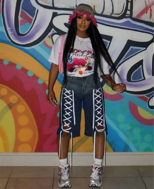 Tie-wrap Washed Denim Knee Shorts