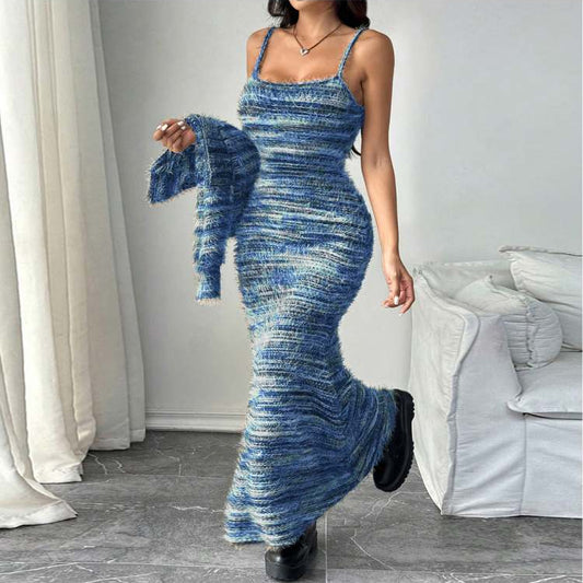 Fluff Striped Sleeveless Maxi Dress Coats 2 Piece Sets