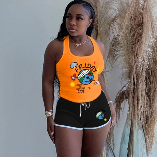 Casual Printing Plus Size Sports Tank Top Two-Piece Shorts Set
