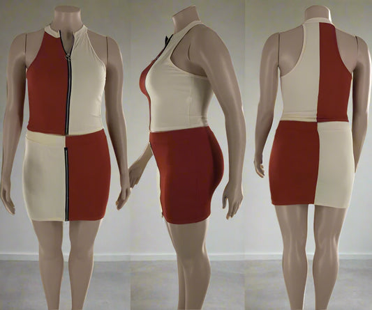 Colorblock Zipper Cropped Bodycon Skirt Set