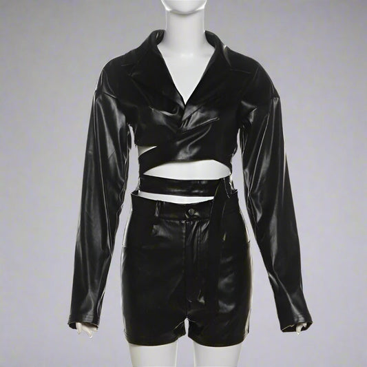 Lace Up PU Lapel Cropped Jackets Short Sets