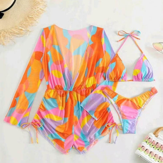 Colorblock Ruched Long Sleeve 3-piece Set Bikinis