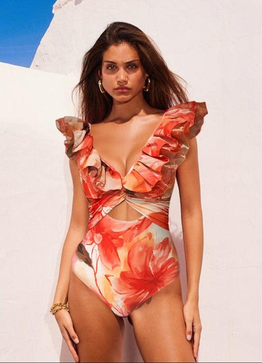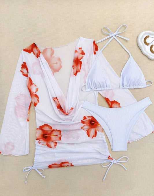 Flower Printed Drawstring 3 Pieces Bikinis Set