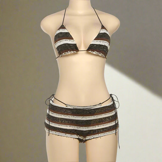 Striped Lace Up Bikinis Short 3 Piece Sets