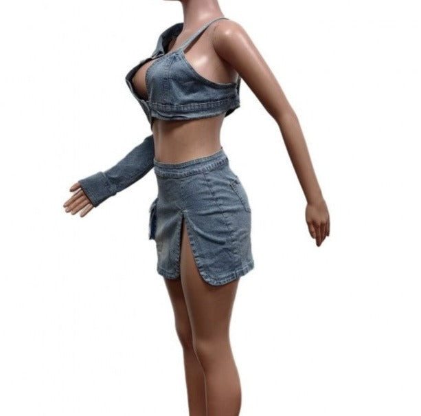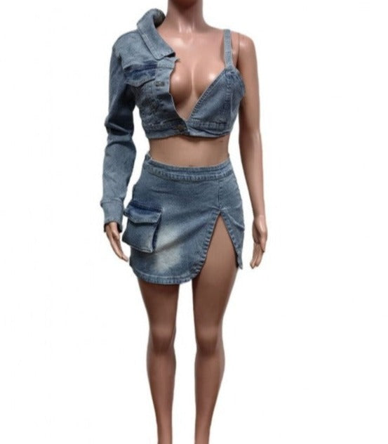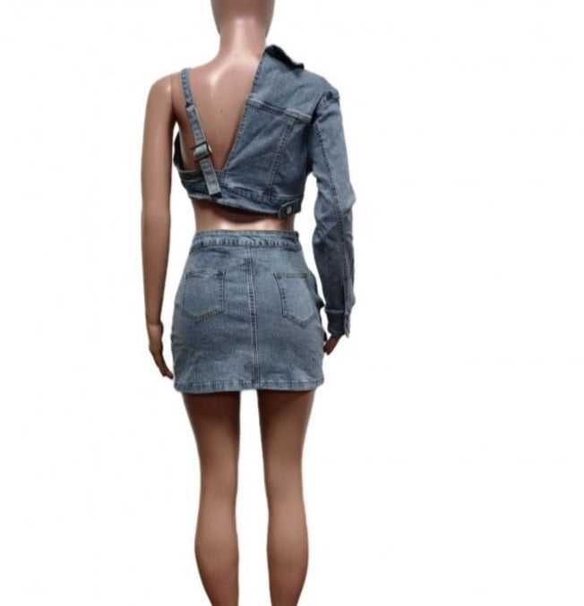 Ensemble sac de sport en jean et jupe à une épaule