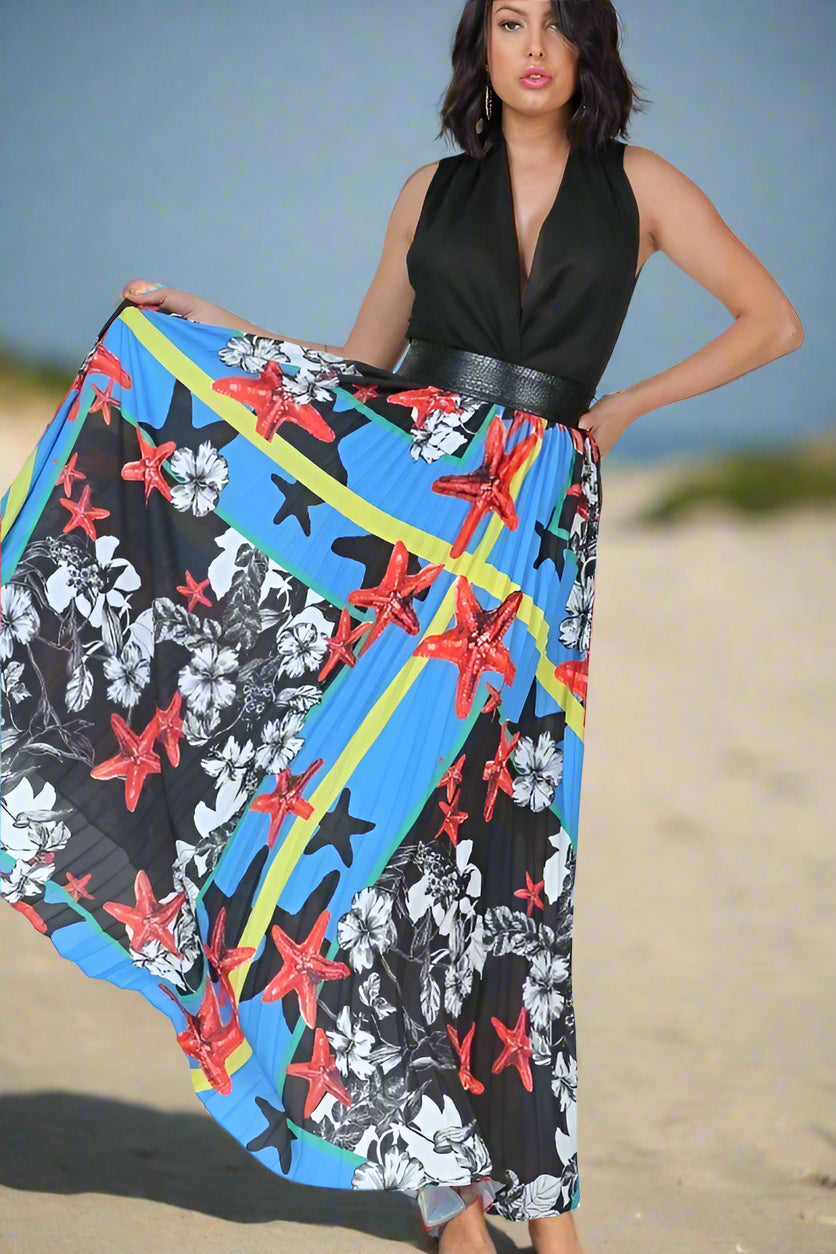 Pleated Print Maxi Skirt With Leather Waist Band