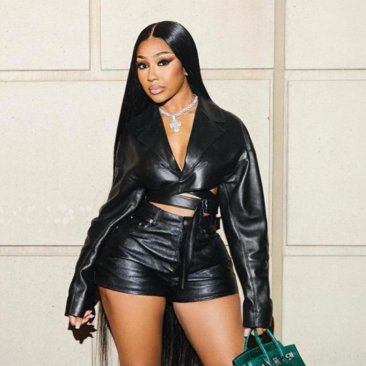 Lace Up PU Lapel Cropped Jackets Short Sets