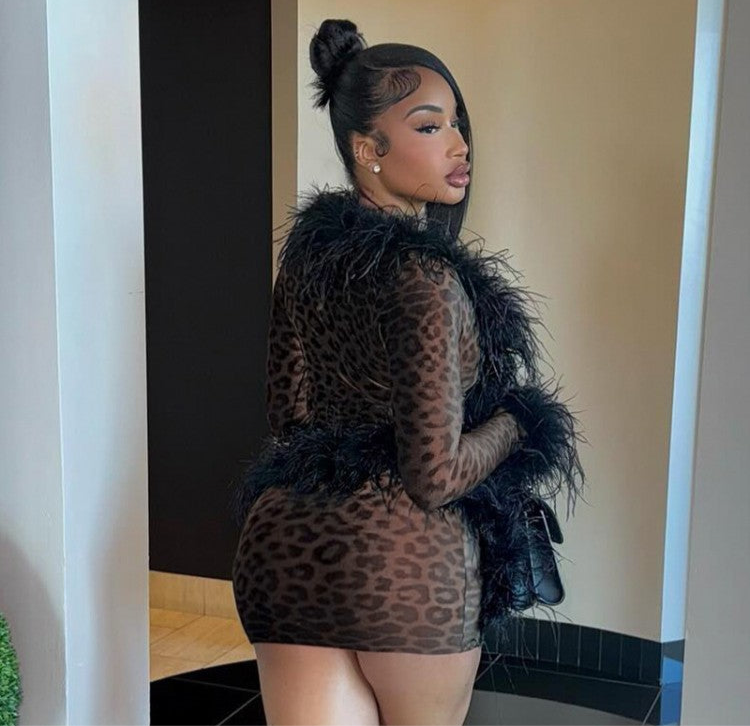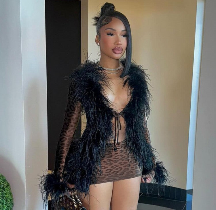 Leopard Feather Patchwork Cardigan 2pcs Skirt Sets